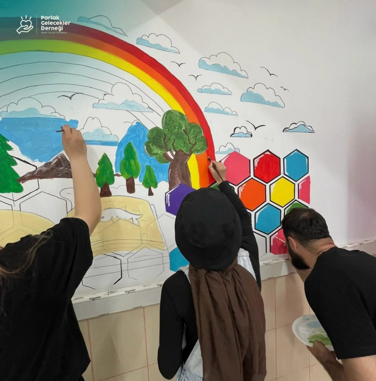 Our students, who realized the first mural painting experience in their lives, carried out every stage of the process from drawing to coloring together and designed it in a way to feed the imagination of children with the figures they chose.